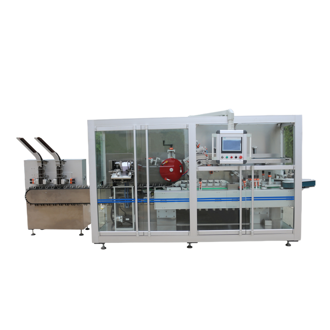 連續(xù)運轉(zhuǎn),紙盒與藥品都是呈臥倒方式進行包裝裝盒。